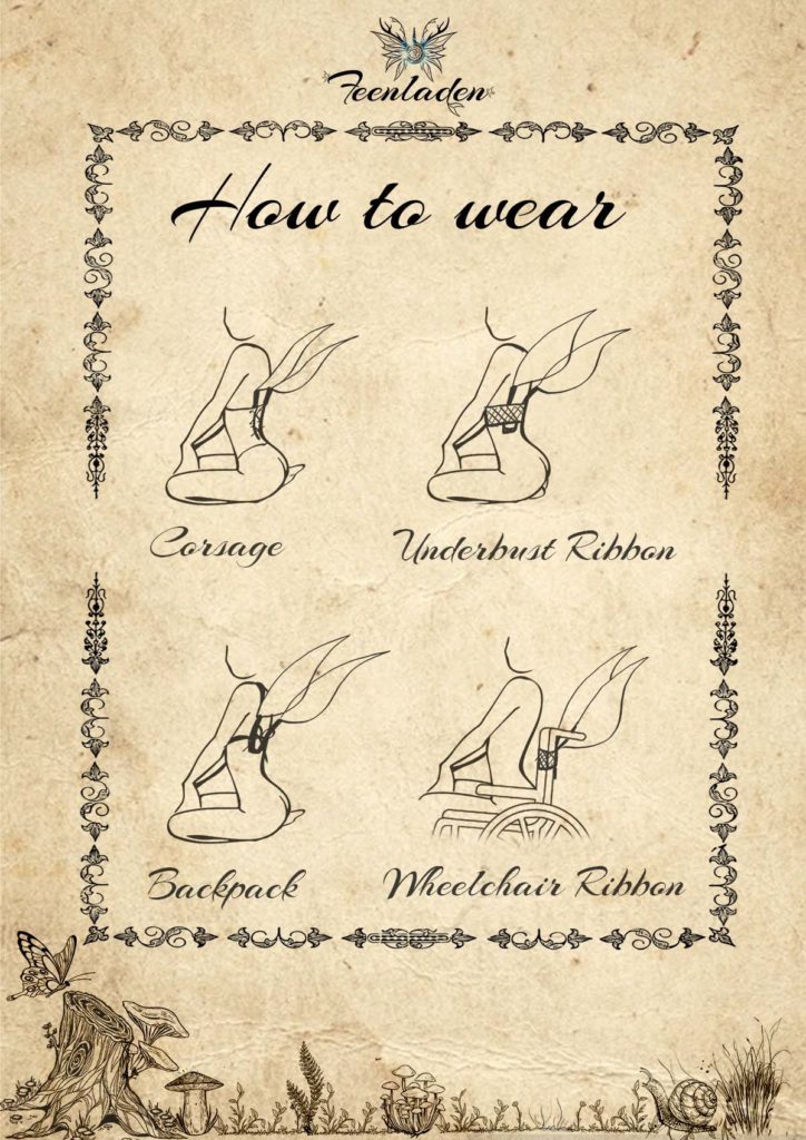 Es gibt entweder einen Brustgurt, den man bei mir in Auftrag geben kann (Kosten ca. 30-35€ extra) oder man nimmt sich selbst ein breites Gummiband und bindet es entweder unter oder überbrust zusammen. Nun kann man die Flügel am Rücken zwischen Gummiband und Haut stecken. Hält wie bei einem Bh.